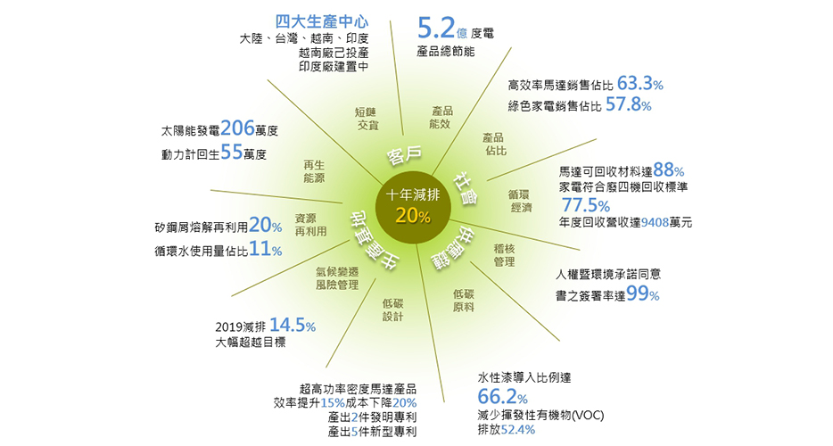 由于全球暖化,溫室效應(yīng)已對全人類產(chǎn)生沖擊,東元以「節(jié)能、減排、智能、自動」的愿景領(lǐng)先「國家溫室氣體減量目標(biāo)」,從原料供應(yīng)鏈、高效率產(chǎn)品設(shè)計(jì)及生產(chǎn)制程進(jìn)一步檢視、監(jiān)控,期能由內(nèi)而外,由上而下,達(dá)到整體產(chǎn)品生命周期及供應(yīng)鏈綠化之目標(biāo)。針對管理方式及目標(biāo),東元宣示「十年減排20%」,基準(zhǔn)年設(shè)定為2015,目標(biāo)在2025年時(shí)降低20%的碳排放,比國家目標(biāo)高出兩倍,直追歐盟2050年零排放水平,維持國際級競爭力